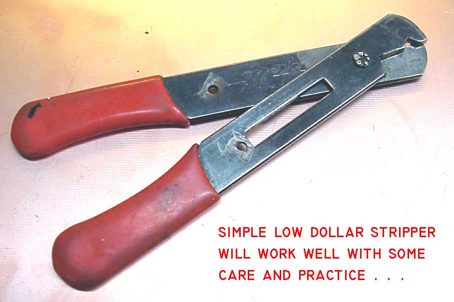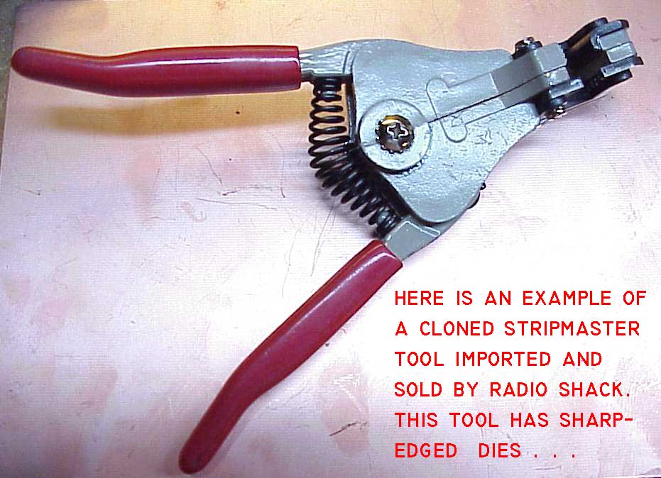 Click here for larger image. On occasion, I've invited the displeasure of various observers by stripping the end of a wire with this kind of tool. This critter IS sharp . . . it IS designed to CUT wires but that doesn't mean that you HAVE to cut wires. I have taught myself to give the insulation a little mash with the sharpened edges and then rotate the tool 90 degrees. Apply and hold a second mash and then pull. The insulation comes off with no contact of the blades against wire strands. This is fun to do in front of some puffed-up inspector-type who is ready to have me keel-hauled for having damaged a wire that I intend to connect to an airplane. I invite him to get out his magnifying glass and show me damaged strands. Admittedly, the END of the INSULATION doesn't come off as cleanly as with the high-dollar tool but it's not bad either. The slightly ragged insulation does not interfere with the final installation and in most situations, the rough end disappears inside the insulation grip of a terminal or inside the back-shell of a connector and you can't even see it. If one understands the task there may be a number of ways to skin the proverbial cat no matter what tools are at hand. All of the tools illustrated above were found in my various tool boxes. When I'm working at the bench, I make regular use of both the high-dollar strippers and Radio Shack Stripmaster clones - they DO offer a level of convenience and low-effort repeatability. However, there are ways to get the job done in a technically sound manner when working with tools that come from a little wooden box that fits in a briefcase. Bottom line is that you can try out and/or learn to use a variety of stripping tools and decide which ones best meet your needs, patience and willingness to acquire some new skills. UNDERSTANDING how it's suppose to work and what the requirements are for end results will give you a lot of latitude for adopting various solutions. Happy stripping . . . 'lectric Bob |