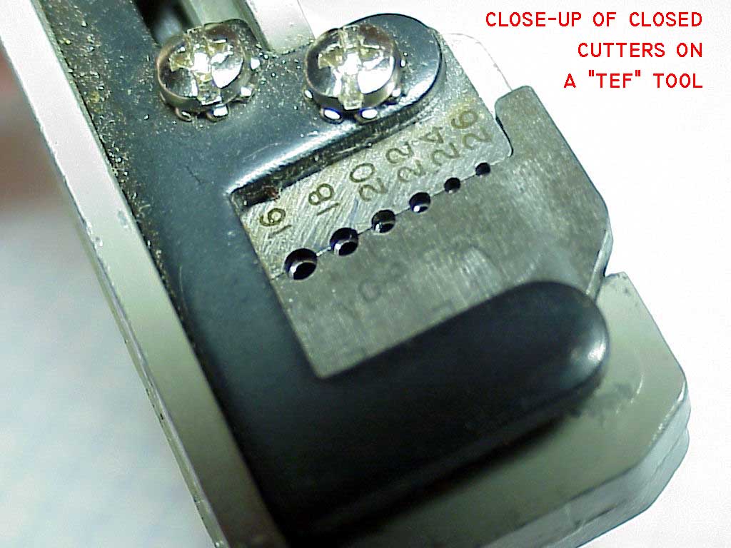 Click here for larger image. A close up inspection of the stripping dies on this tool shows us a relatively simple, knife-edged cutter with holes sized to provide clearance around various wire sizes while the knives are expected to cut the insulation without damaging underlying wires. Squeezing the handles drives the wire-grip and blades apart . . if everything goes well, insulation is neatly removed from the end of the wire. |