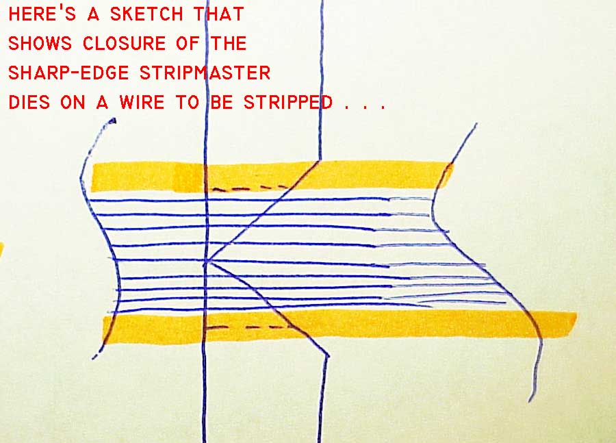 Click here for larger image. A sketch of this stripper's cross section illustrates the manner in which the blades come together. If the wire stranding is oversized or if you use a "too small" opening to strip the wire, there is possibility of damage to the conductors. |