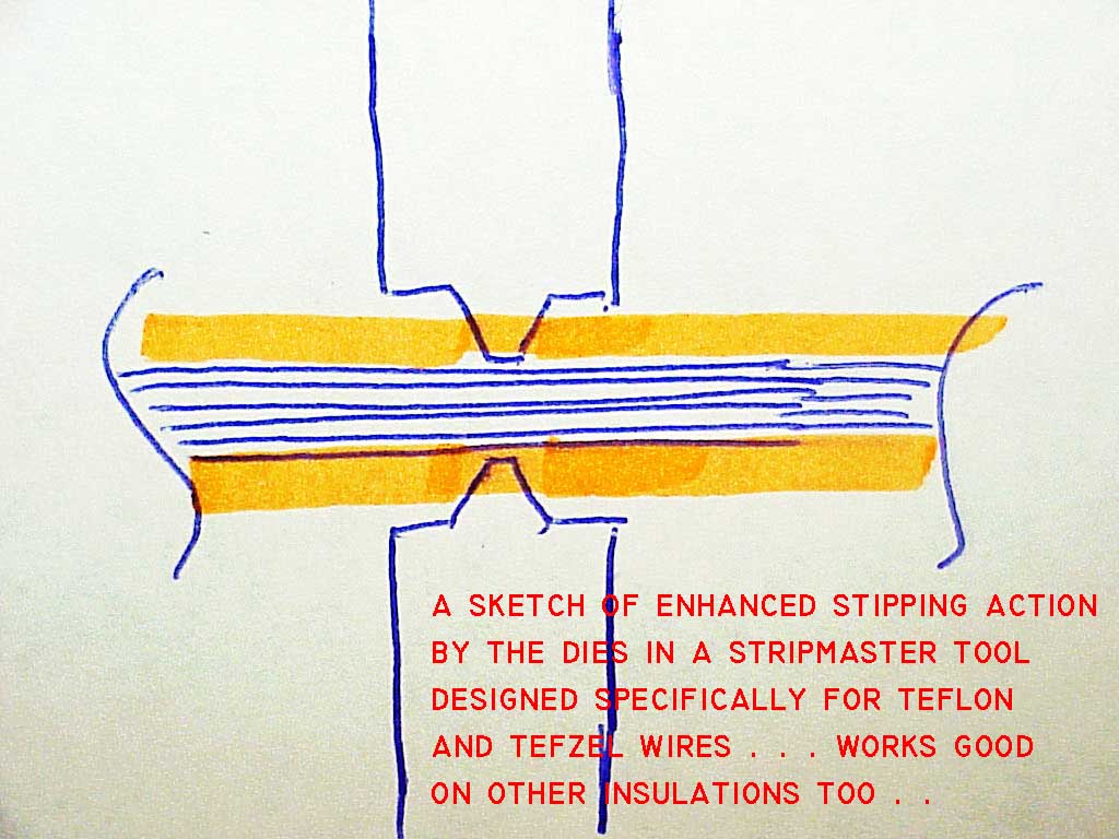 Click here for larger image. Here's a sketch of how the "tef" dies come down on the wire's insulation. Even if the blades do touch the conductors, there are no sharp edges to damage the strands. Obviously, there's not much cutting going on either. My grandma used to harvest the chicken for Sunday dinner by standing on a broomstick placed across the chicken's neck and pulling on the legs . . . no cutting required. Just grab it around the spot where you want to create a stress-riser and pull. Off it comes. |